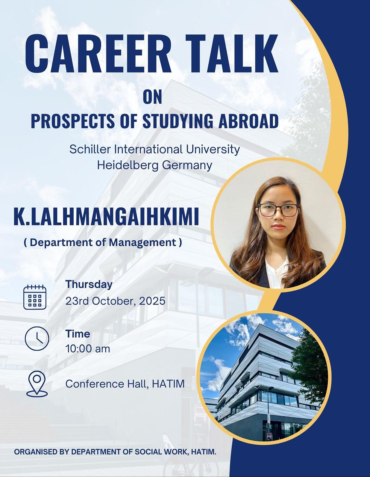 A career talk on the topic “Prospects of Studying Abroad” was conducted on the 23rd of October by the Department of Social Work, HATIM. The session was held from 10:00 a.m. to 11:30 a.m., with Ms. K. Lalhmangaihkimi, from the Department of Management, Schiller University, Heidelberg, as the resource person. The program was chaired by Dr. C. Lalremtluangi, who gave a brief introduction about the speaker, highlighting her academic background, achievements.