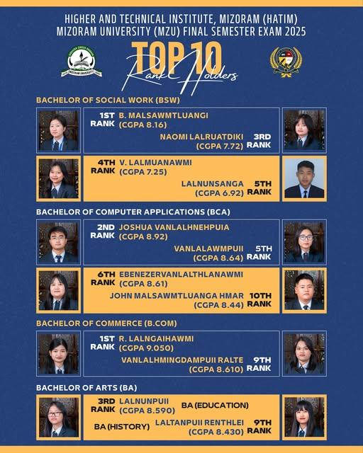 Mizoram University (MZU) Final Semester Exam 2025, TOP 10 RANK HOLDERS